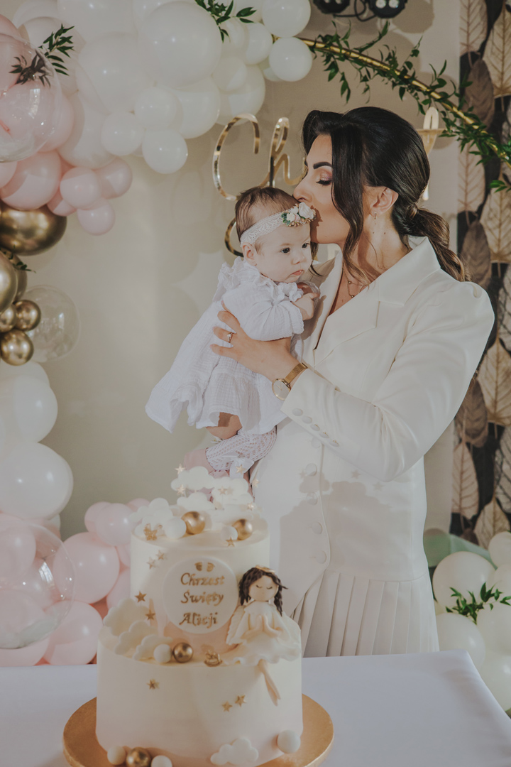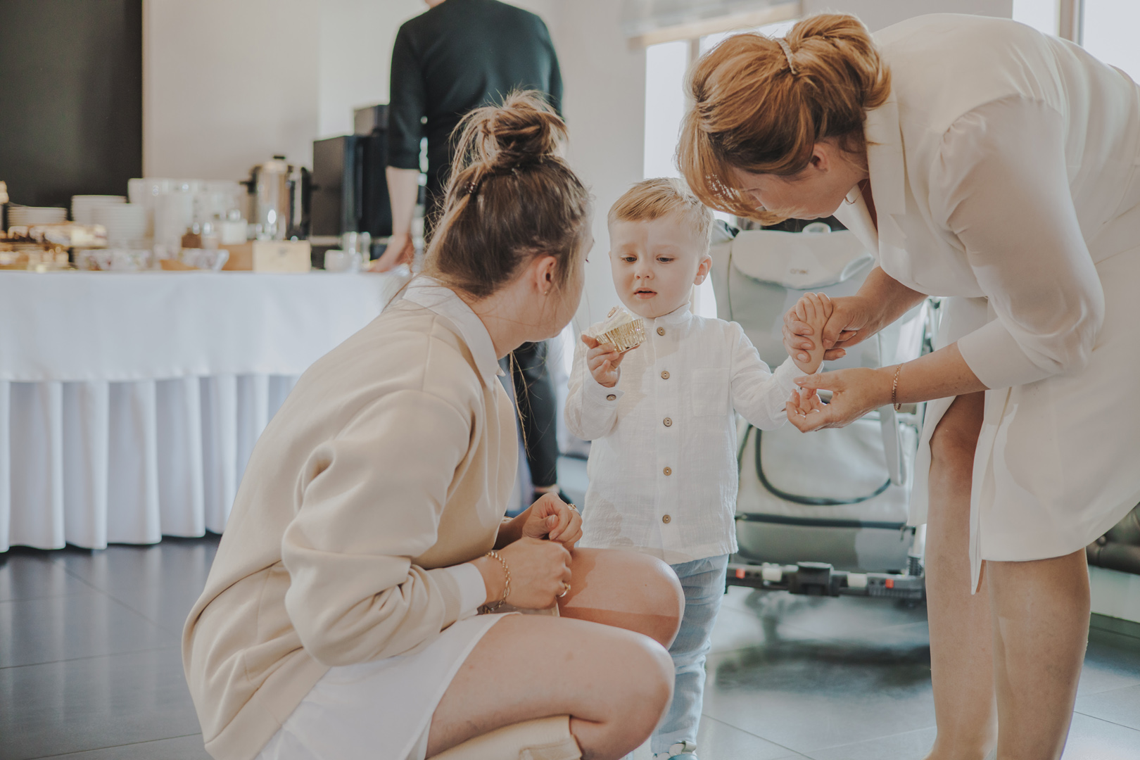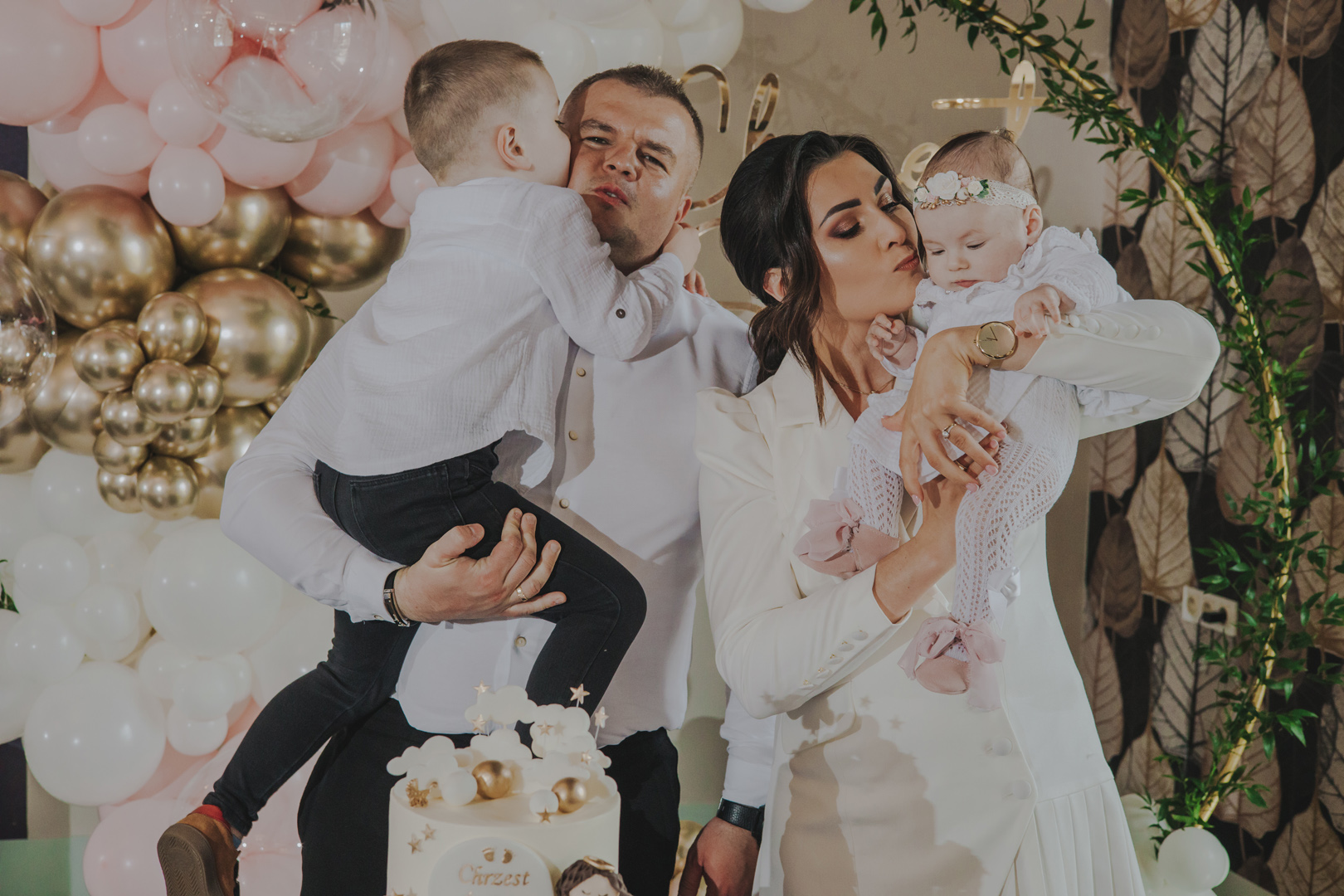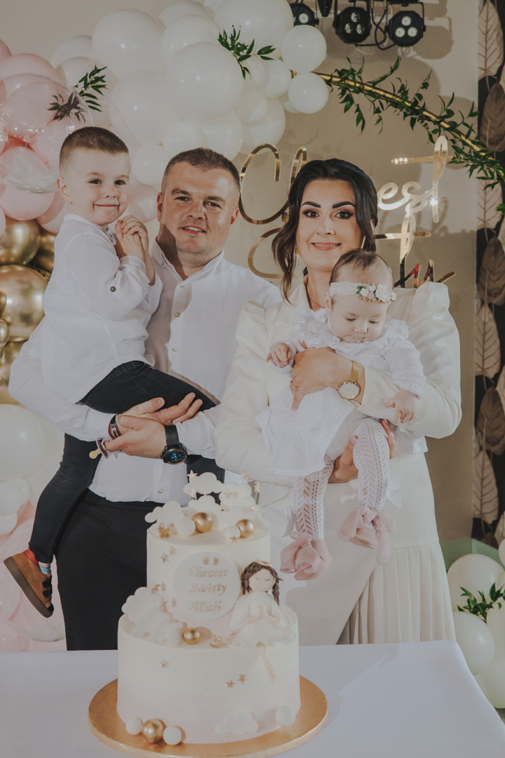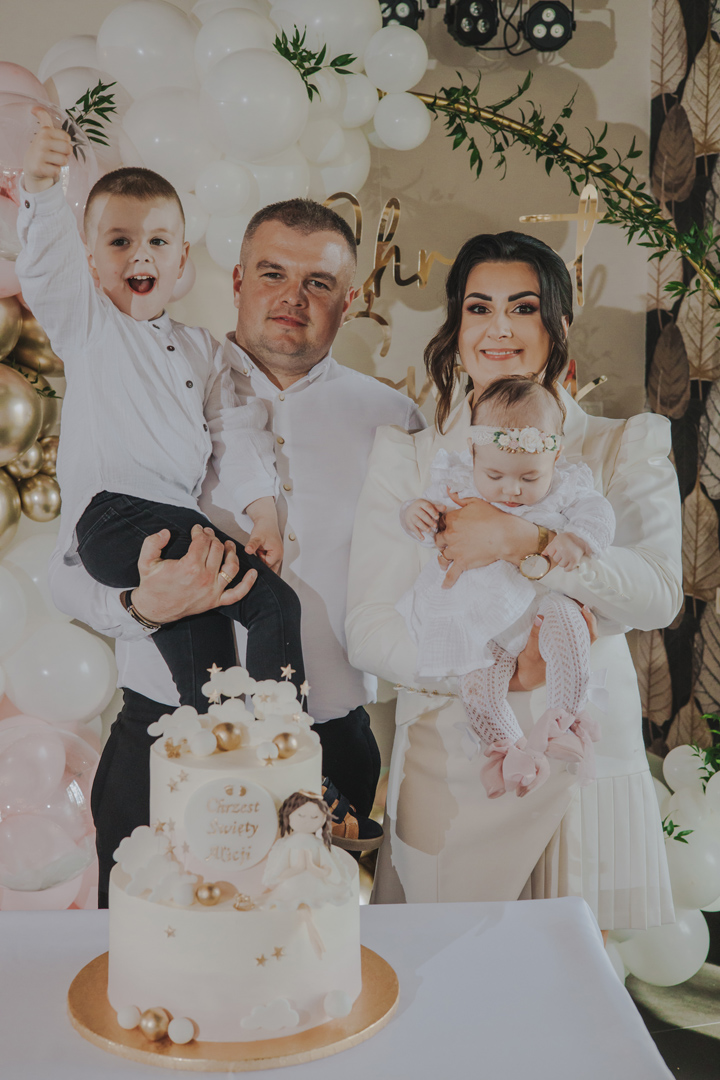 Kiedy nie śpi dziecko, wchodzimy na sale i zaczynamy od sesji. Ten dzień może dać się we znaki dziecku, a wiemy, że sen jest najlepszym odstresowaczem, dlatego dopóki nie śpi wykorzystujemy sytuację. Wykonuję zdjęcie grupowe i sesje indywidualną na ściance lub w ogrodzie. Kolejno kilka fot podczas wręczania prezentów dziecku i obiad. Fotograf ma wtedy czas wolny. Kuchnia wydaje dania, podczas posiłków nie fotografujemy. Często na deser wjeżdża tort. ostatni krok. Piękne, pamiątkowe zdjęcia przy torcie są zwieńczeniem reportażu.