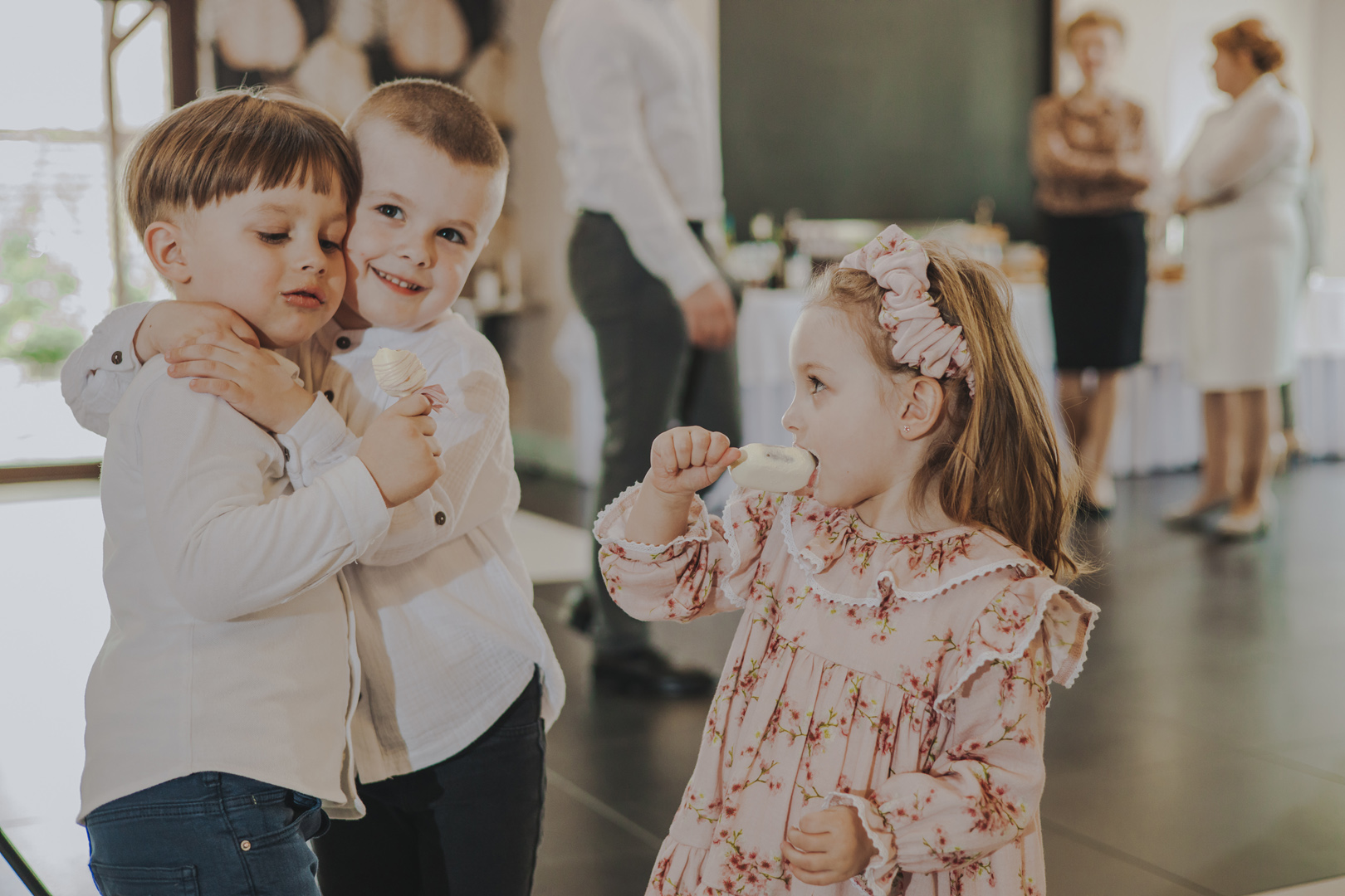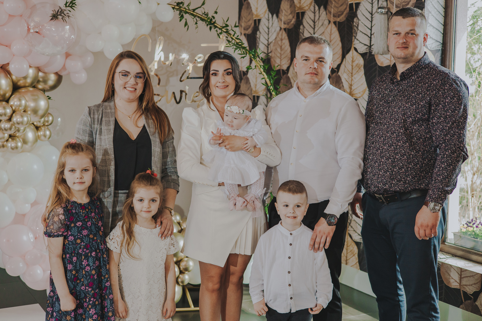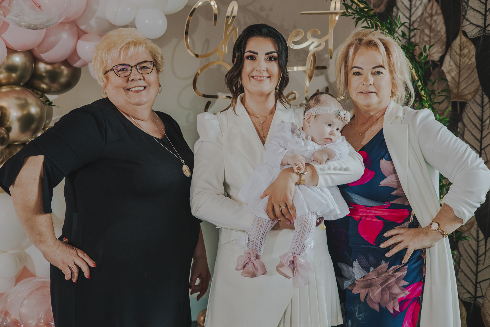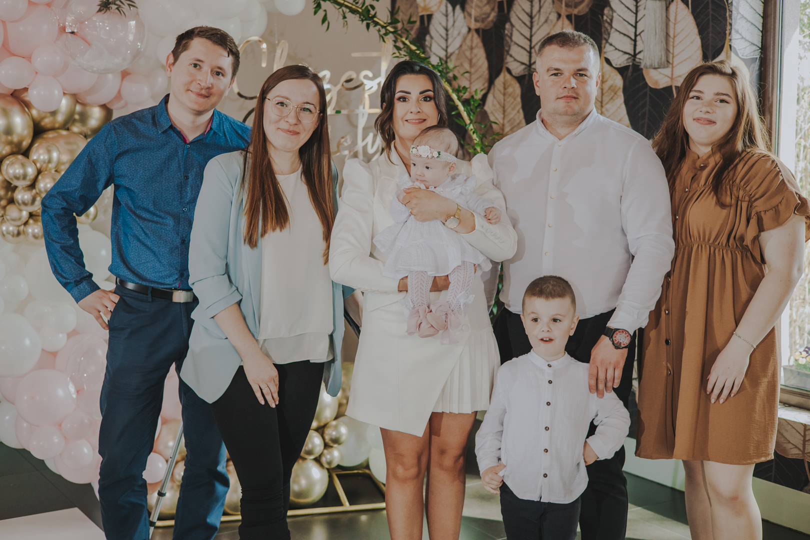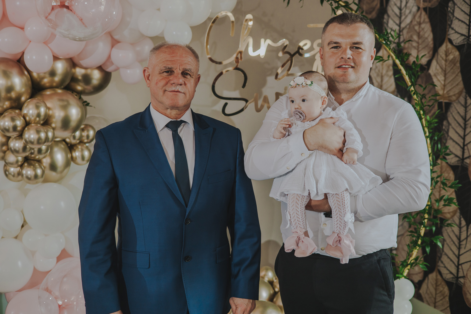 Kiedy nie śpi dziecko, wchodzimy na sale i zaczynamy od sesji. Ten dzień może dać się we znaki dziecku, a wiemy, że sen jest najlepszym odstresowaczem, dlatego dopóki nie śpi wykorzystujemy sytuację. Wykonuję zdjęcie grupowe i sesje indywidualną na ściance lub w ogrodzie. Kolejno kilka fot podczas wręczania prezentów dziecku i obiad. Fotograf ma wtedy czas wolny. Kuchnia wydaje dania, podczas posiłków nie fotografujemy. Często na deser wjeżdża tort. ostatni krok. Piękne, pamiątkowe zdjęcia przy torcie są zwieńczeniem reportażu.