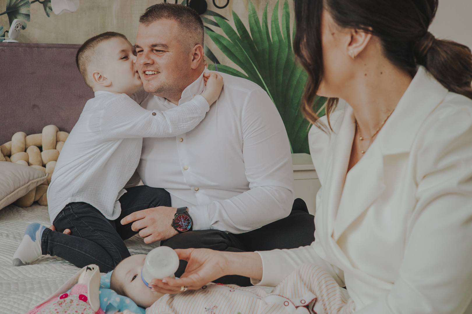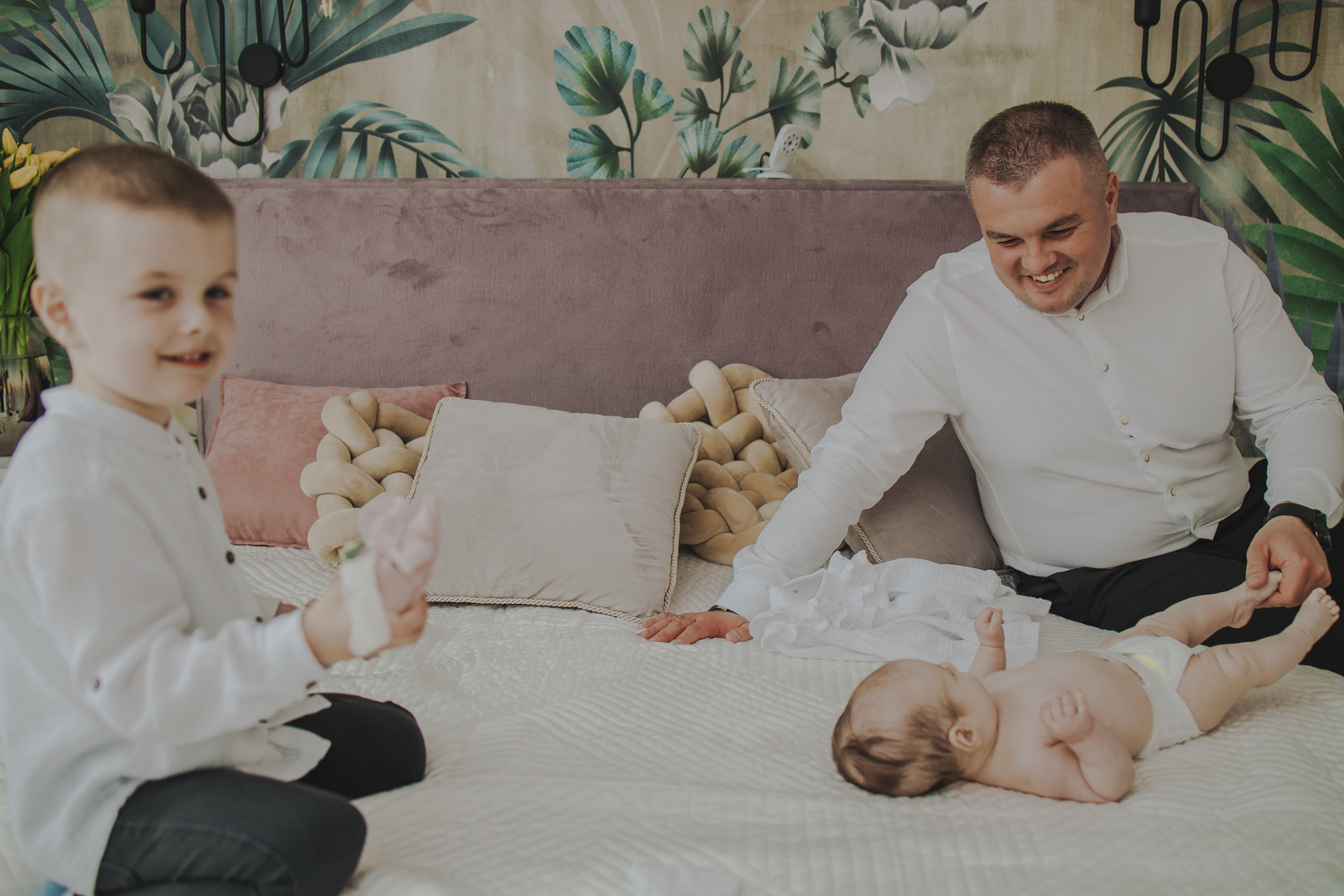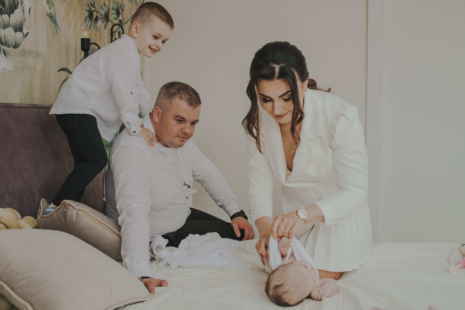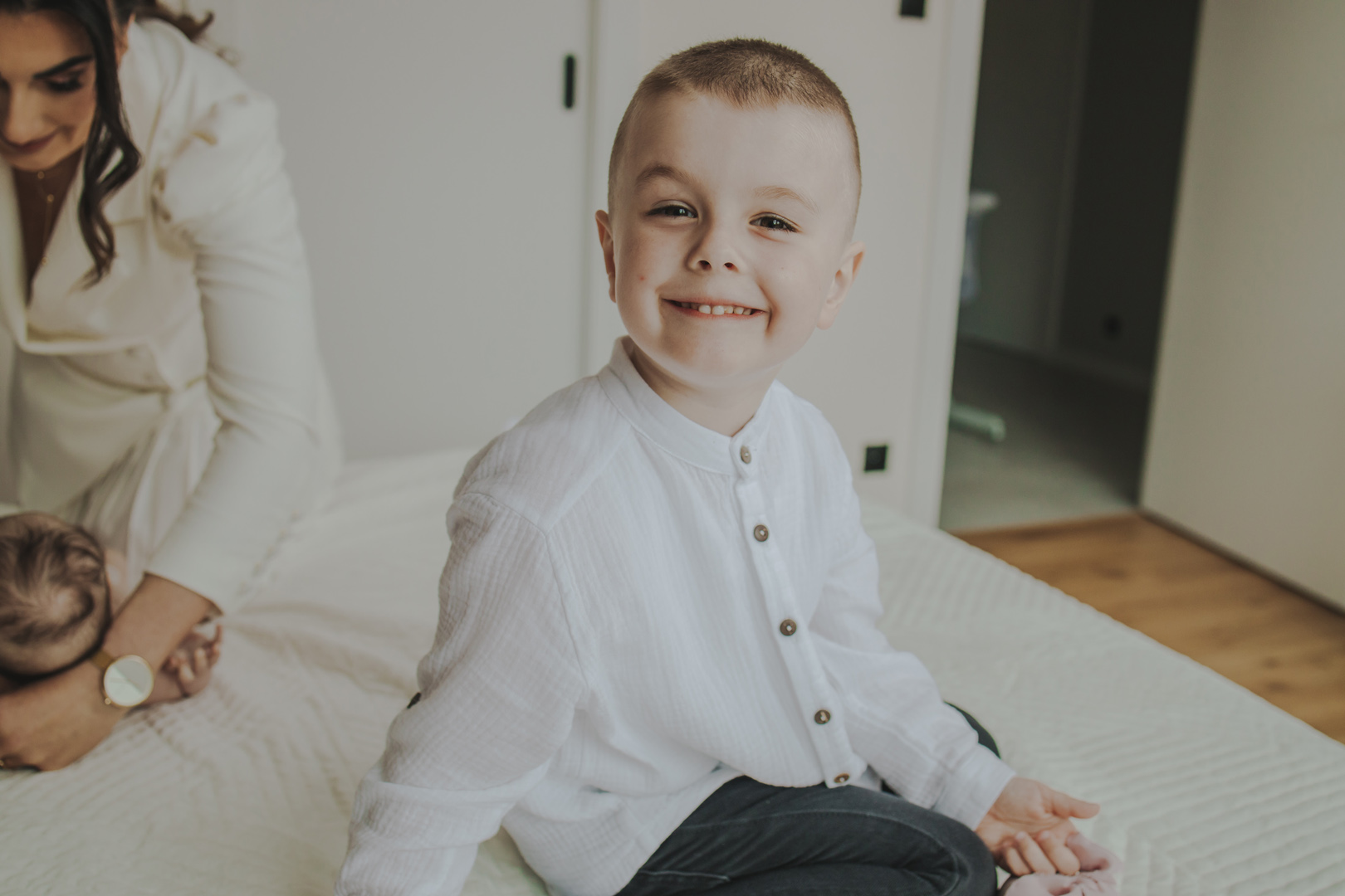 Ubieranie dziecka to jeden z ważniejszych punktów, dziecko jest w swoim domu, wszystko jest mu znane, dlatego też czuje się swobodnie. Musimy pamiętać, że każda mała zmiana dla nas to kolosalna zmiana dla maluszka. Poza tym dom, to miejsce gdzie możemy zrobić sesję rodzinną bez pośpiechu i stresu.